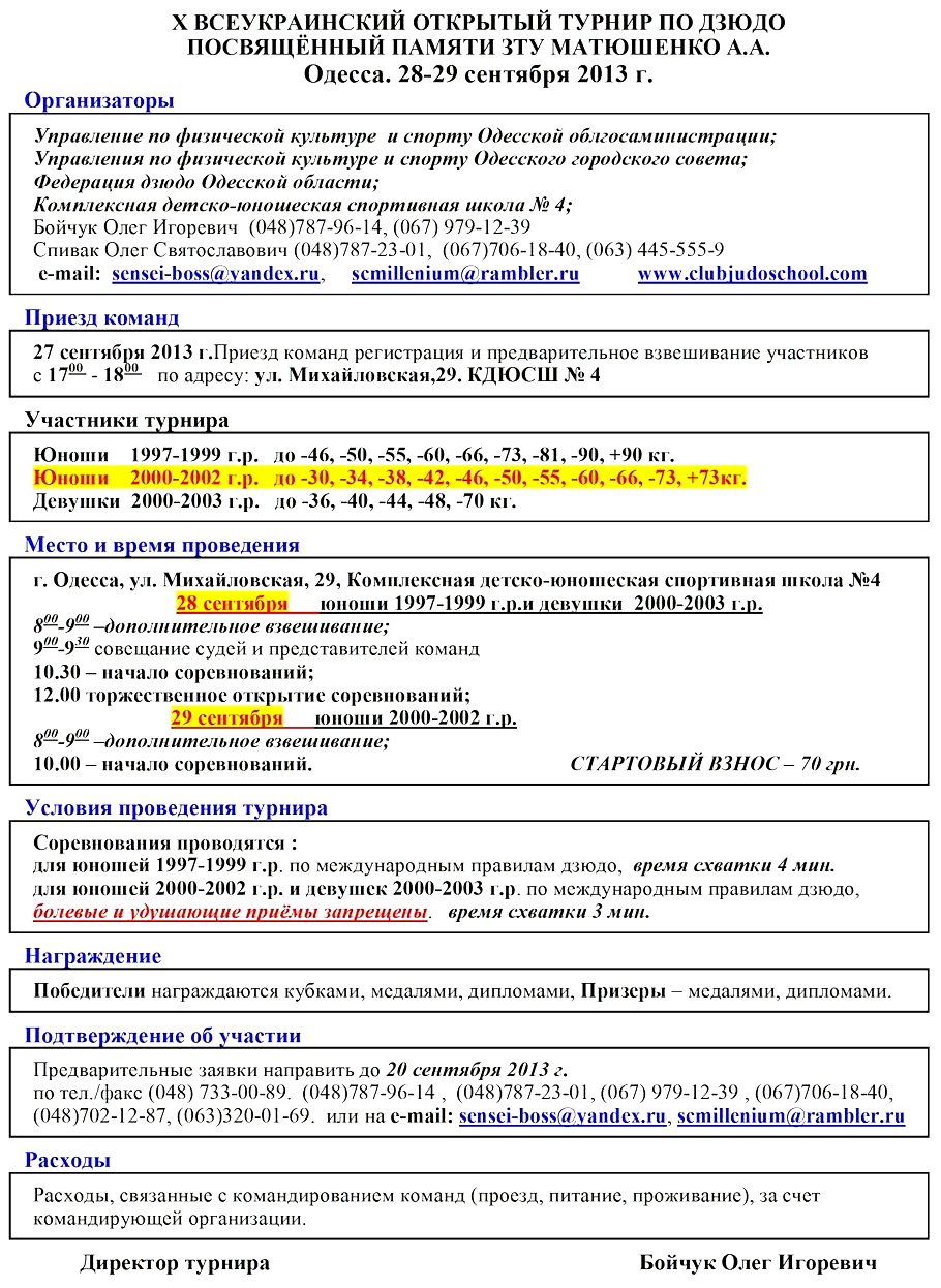 | X ВСЕУКРАИНСКИЙ ОТКРЫТЫЙ ТУРНИР ПО ДЗЮДО, ПОСВЯЩЁННЫЙ ПАМЯТИ ЗТУ МАТЮШЕНКО А.А. Одесса. 28-29 сентября 2013 г.