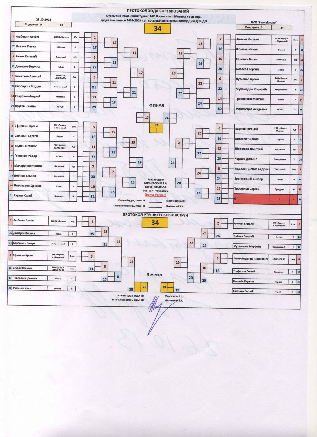 | Турнир получился хороший, не ожидали , а самое главное в положении написано было окончание в 15- с чем то, так реально закончили в 15 - 45 , когда приехали увидели 3 татами и столько народу думали все как обычно 20-22. По поводу судейста главный судья Мартиросян ( если не ошибаюсь , такой небольшого роста но необъятный , сказал, что не потерпит беспредела на ковре и с видео подходить ). 5 поставить можно турниру, те м более проводили первый раз. из приятностей гардероб + ключ от шкафчика можно было рюкзаки оставить и другие вещи , кубки за все 3 места , + Беридзе писал всем? кто подходил напутсвия . Протокл 34 2002-2003 мы 25