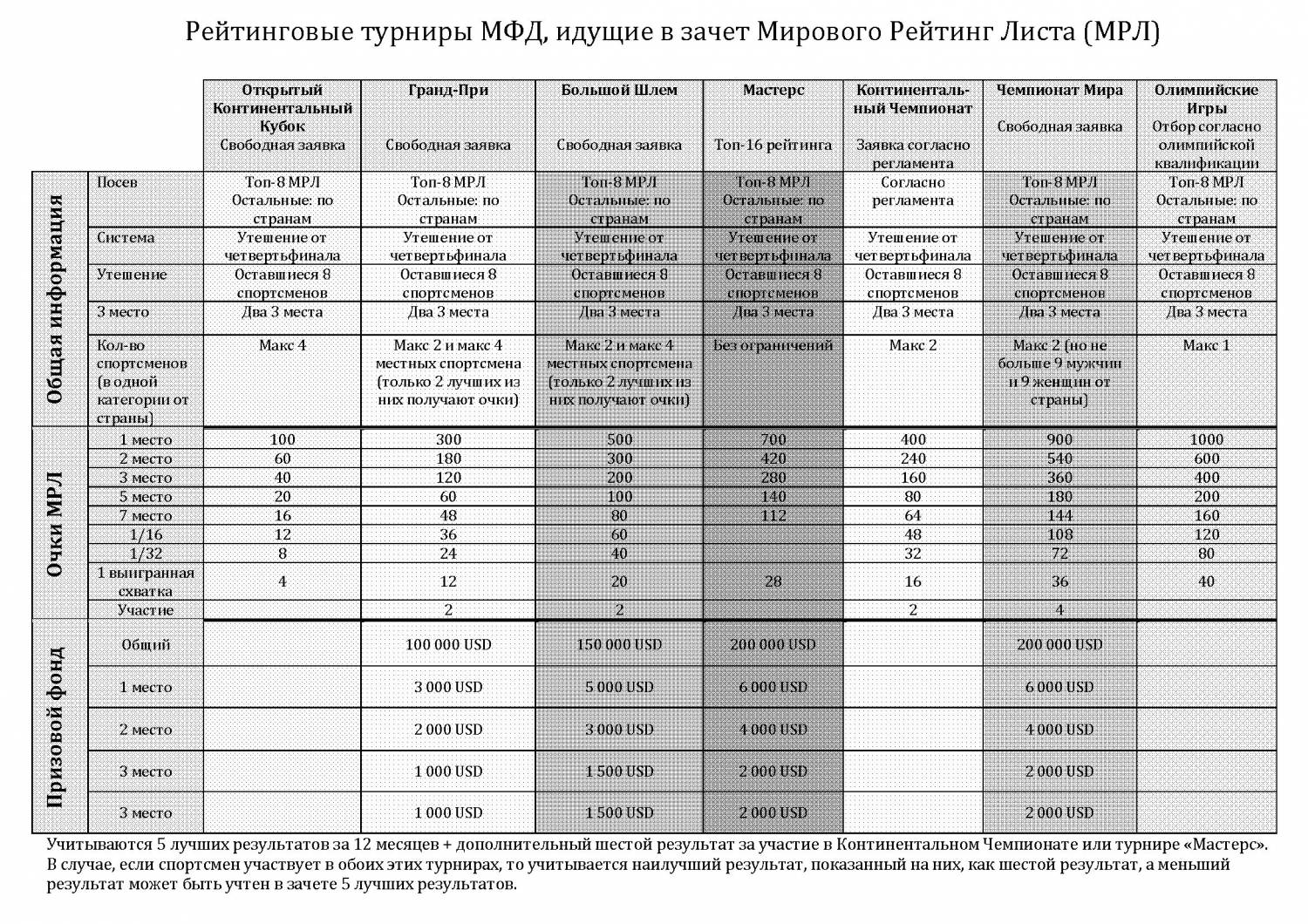 | Обновленный рейтинг-лист IJF. Одиннадцать россиян – в десятке сильнейших 21 марта 2013 В период небольшого затишья в календаре Международной федерации дзюдо стоит обратить внимание на обновленный рейтинг-лист IJF. После «дорогого» домашнего этапа «Большого шлема» в Париже французские дзюдоисты получили лидерство в пяти категориях: Ларос в 66 кг и Ринер в свыше 100 кг у мужчин, а также Павия в 52, Абенену в 57 и Декос в 63 кг – у женщин, и оставили лишь три веса японцам (Такато в 60, Накая в 73 и Хашимото в 52 кг), и по одному: корейцам (Ким в 81 кг), грузинам (Липартелиани в 90 кг), узбекам (Саидов в 100 кг), бразильянкам (Менезес в 48 кг), американкам (Харрисон в 78 кг) и кубинкам (Ортиз в свыше 78 кг). Лучшим из россиян в последнем рейтинге является олимпийский чемпион Лондона Арсен ГАЛСТЯН, занимающий вторую строчку в категории 60 кг. В десятку мирового рейтинга входят еще девять дзюдоистов и одна дзюдоистка. Помимо Арсена в легком весе на пятой строчке расположился чемпион Европы-2012 Беслан МУДРАНОВ, в категории 66 кг на восьмом месте Алим ГАДАНОВ, в весе 73 кг у Мансура ИСАЕВА – четвертая позиция, в 81 кг у Мурата ХАБАЧИРОВА – шестая. В категории 90 кг у Кирилла ВОПРОСОВА девятое место в рейтинге, а у Григория СУЛЕМИНА – десятое. У олимпийского чемпиона Лондона Тагира ХАЙБУЛАЕВА в весе 100 кг – третий результат, а у его товарища по команде - Сергея САМОЙЛОВИЧА – шестой. В мужском супертяже у Александра МИХАЙЛИНА – четвертая строчка, а в женском у Елены ИВАЩЕНКО – седьмая. Мужчины 60 кг Вторую строчку в наилегчайшем весе у мужчин вслед за 20-летним чемпионом мира среди кадетов и юниоров, победителем парижского турнира этого года Наохиса Такато (1288) занимает российский обладатель золота Игр-2012 Арсен ГАЛСТЯН (994 балла). Пятым в рейтинге легковесов идет чемпион Европы-2012 Беслан МУДРАНОВ (890). Компанию Галстяну и Мудранову в этой категории составляют 34. Роберт Мшвидобадзе (264), 50. Арам Григорян (160), 62. Евгений Кудяков (120), 131. Ай-Херел Балчакпан (24), 136. Петр Жуков (20), 143. Дмитрий Куликов (20), 163. Константин Крупский (12), 185. Ерванд Мгдсян, Сергей Кртян и Отар Бестаев (8). 257. Джейхун Эйюбов, Мурад Абдулаев, Антон Хорошилов, Руслан Кишмахов, Денис Лаврентьев, Якуб Шамилов, Максим Бурнашев и Алексей Шкоров – без квалификационных очков. 66 кг Лидером в этой категории стал двукратный победитель «Большого шлема» в Париже француз Давид Ларос, набравший 1120 очков. Российский чемпион Европы-2012 Алим ГАДАНОВ (706) занимает восьмую строчку, а перешедший после Олимпиады из 66 в 73 кг бронзовый медалист чемпионата мира-2011 россиянин Муса Могушков (540) переместился на 12 место WRL. …19. Камал Хан-Магомедов (398), 22. Денис Лаврентьев (380), 25. Михаил Пуляев (360), 57. Абдула Абдулжалилов (136), 58. Якуб Шамилов (136), 127. Максим Кузнецов (36), 148. Анзаур Арданов (20), 227. Олег Васильев (6), 236. Иван Спирин (4). Без рейтинговых баллов на 294 позиции - Алексей Величко, Дмитрий Клецков, Алихан Аюбов, Владимир Леонтьев, Дмитрий Туко и Армен Авагян. 73 кг Чемпион мира-2011 японец Рики Накая удержался на вершине рейтинга с 1174 баллами, что на 166 больше, чем у лучшего из россиян – олимпийского чемпиона-2012 Мансура ИСАЕВА (1008) – он на четвертой строчке WRL. …13. Мурад Кодзоков (544), 52. Батраз Кайтмазов (150), 65. Егор Рыбин (120), 83. Сергей Бадриашвили (84), 104. Зелимхан Оздоев (62), 128. Алексей Астафьев (40), 208. Денис Ярцев (16), 234. Станислав Скрябин (10), 243. Павел Малахов и Сергей Николаев (8), 24