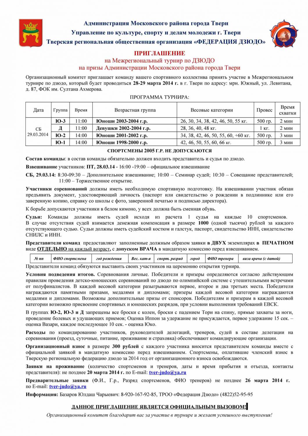ПРИГЛАШЕНИЕ на Межрегиональный турнир по ДЗЮДО на призы Администрации Московского района города Твери