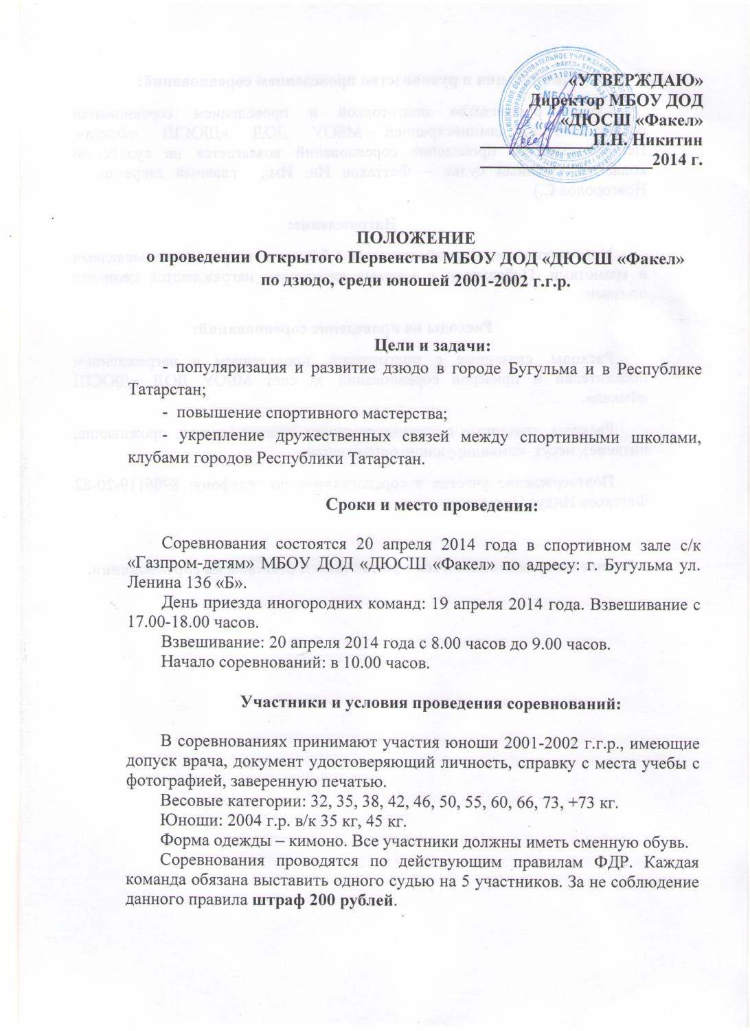 | Открытое Первенство МБОУ ДОД "ДЮСШ" "Факел" по дзюдо среди юношей 2001-2002 г.р. и 2004 г.р. Место: г.Бугульма Дата: 20 апреля 2014 8:00 - 19:00 20 апреля 2014 года в городе Бугульма РТ по адресу ул.Ленина д.136 Б в зале С/К "Газпром-детям" МБОУ ДОД "ДЮСШ" "Факел" пройдёт открытое Первенство среди юношей 2001-2002 г.р., высовые категории: 32 кг.,35кг.,38 кг.,42 кг.,46 кг.,50 кг.,55кг.,60 кг.,66кг.,73кг.,+73 кг. и 2004 г.р. весовые категории 35 кг. и 45 кг.
