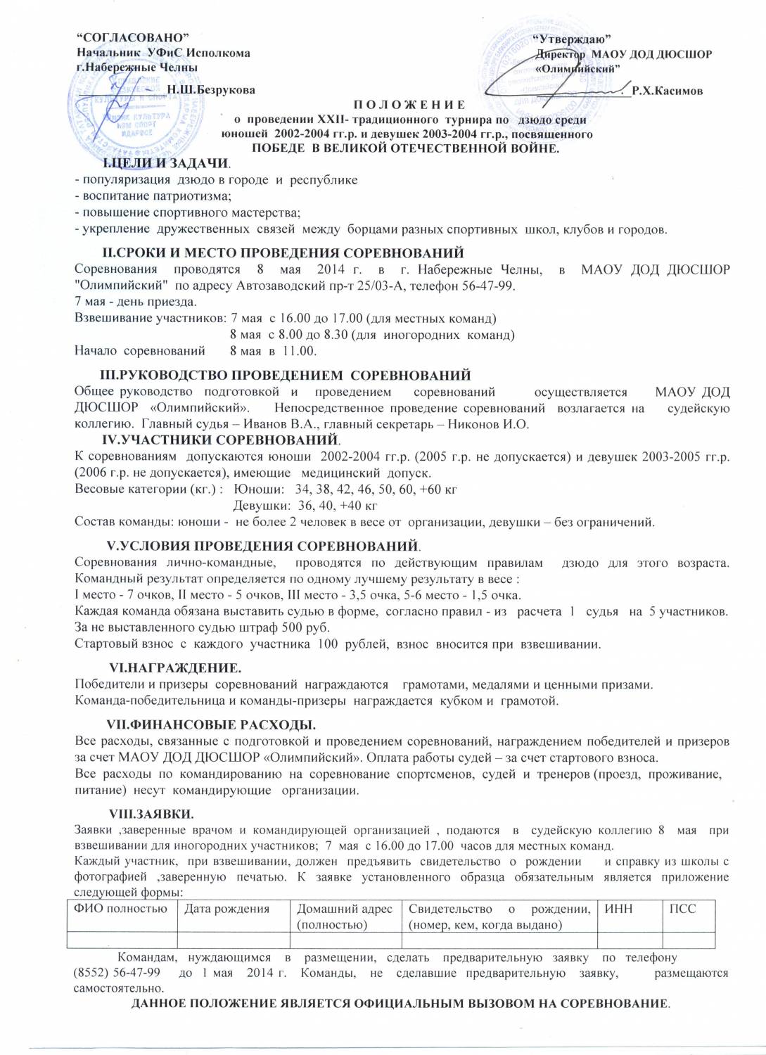 | XXII традиционный турнир по дзюдо среди юношей 2002-2004 г.р. и девушек 2003-2004 г.р. Место: г.Набережные Челны Дата: 7 мая 2014 16:00 - 8 мая 2014 19:00 7-8 мая 2014 года в городе Набережные Челны МАОУ ДОД ДЮСШОР "Олимпийский" по адресу Автозаводской пр-т 25/03-А т.56-47-99 пройдёт XXII традиционный турнир по дзюдо среди юношей 2002-2004 г.р. весовые категории: 34 кг., 38 кг., 42 кг., 46 кг., 50 кг., 60 кг.,+60 кг. и девушек 2003-2004 г.р. весовые категории 36 кг.,40 кг. и +40 кг.