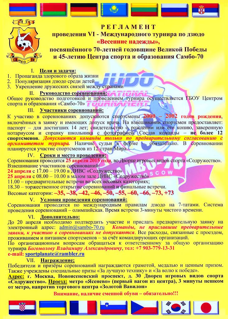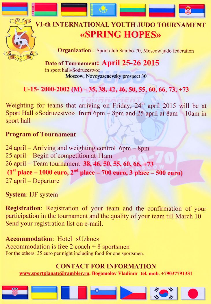 26-27 апреля во Дворце игровых видов спорта «Содружество» прошел юбилейный V Международный турнир по дзюдо среди юношей 2000-2002 г.р. «Весенние надежды». Организаторами выступили Департамент физической культуры и спорта города Москвы, Центр спорта и образования «Самбо-70», Некоммерческое партнерство «Дети России Образованы и Здоровы – ДРОЗД», Федерация дзюдо Москвы.