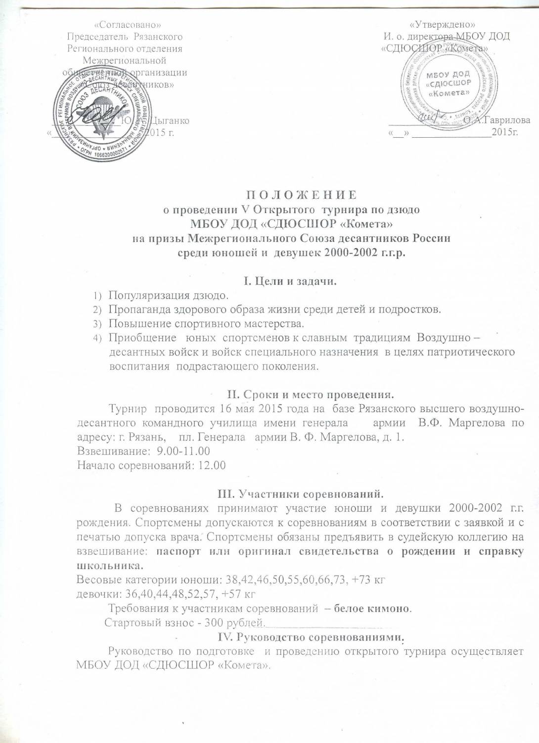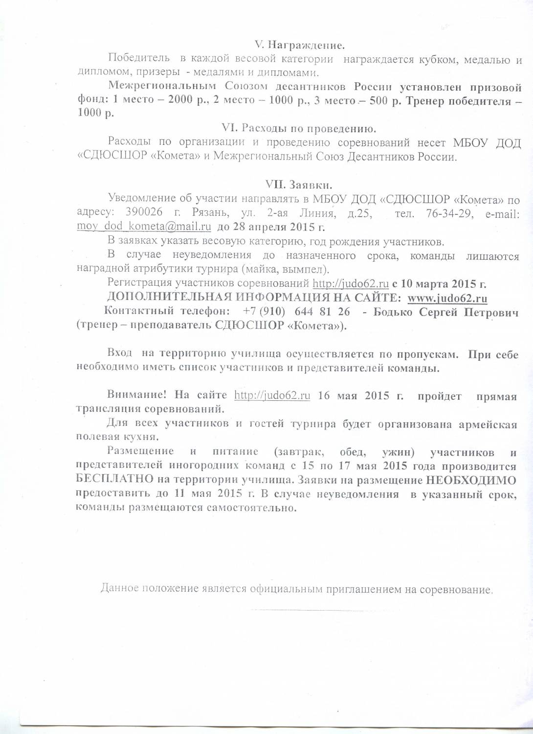 Дата проведения соревнования -16 мая 2015 года на базе Рязанского высшего воздушно-десантного командного училища имени генерала армии В.Ф. Маргелова по адресу :г.Рязань, пл. Генерала армии В.Ф. Маргелова, д.1 Взвешивание 9.00 - 11.00 Начало соревнований 12.00