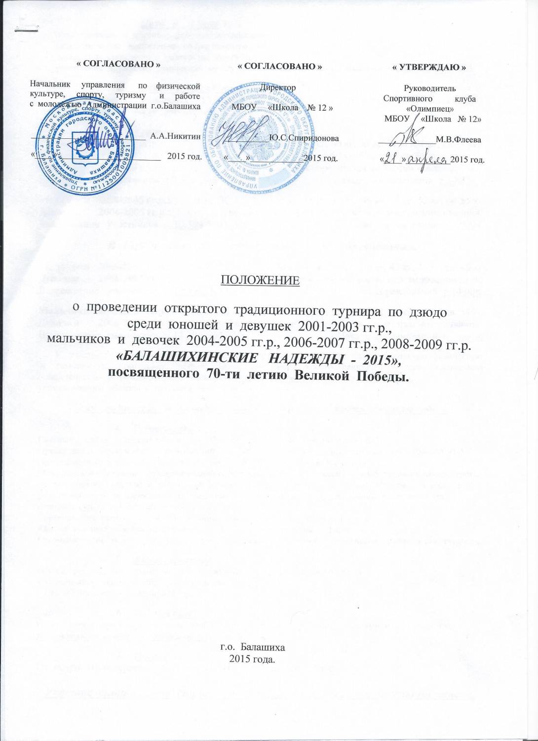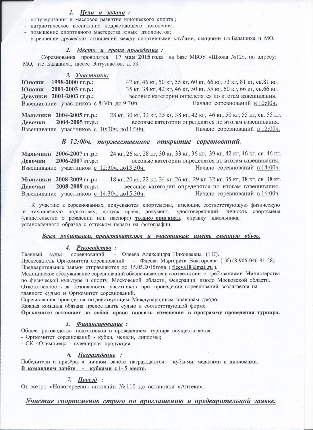 | Традиционный турнир по дзюдо "Балашихинские надежды" 17 мая 2015г г. Балашиха. Юноши 1998-00, юноши и девушки 2001-03гг.р, 2004-05, 2006-07,2008-09гг.р. Личный и Командный зачет. Стартовый взнос 500р.