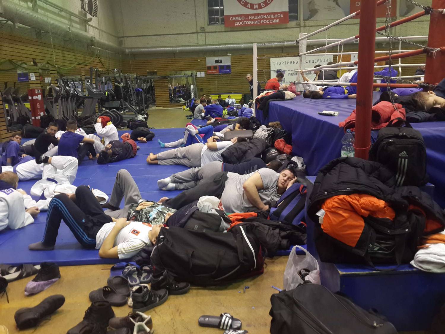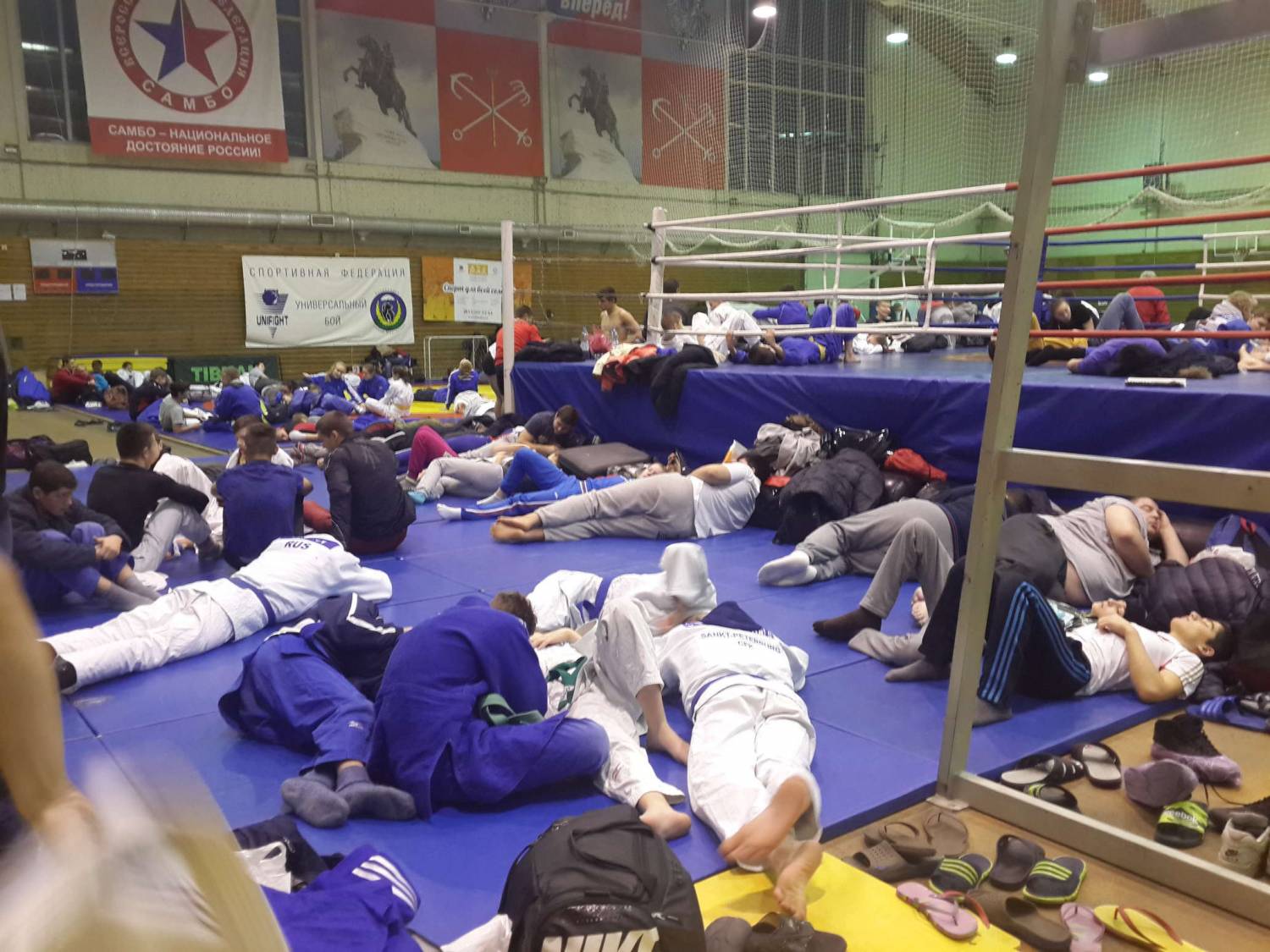 | Теперь о впечатлениях. Для такого количества участников (400) и уровня турнира зал явно маловат. Всего 4 татами. Нормально сесть и посмотреть было явно проблематично - 3-х ярусные трибуны по одной стороне вдоль трёх татами и всё. В зал начали пускать в 7.00. До этого сидели в вестибюле. На предварительном взвешивании попробовали несколько весов. В раздевалке весы врали безбожно, а в зале разброс между весами был в 100г. Не знаю насколько это критично, но на официальном нам достались нормальные. После взвешивания зал превратился в "лежбище тюленей"
