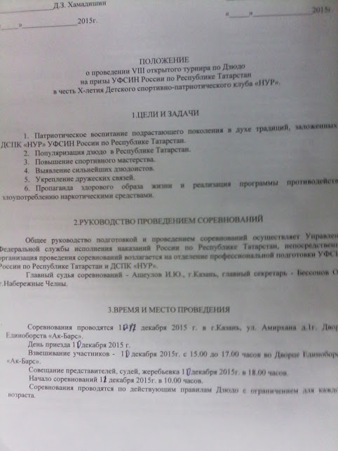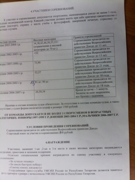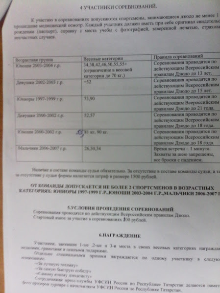 | Понятно,что турнир юбилейный,будет проходить в шикарном "Дворце единоборств",построенном к Всемирной Универсиаде 2013 г.,будут шикарные призы и отличная организация,поэтому организаторы,т.е. клуб,причём не самый большой в Татарстане,но имеющий немалые успехи и хорошую репутацию, позволил себе,с целью задействования в турнире максимум своих воспитанников,выборочные возрастные и весовые категории.Я думаю,никто не обидится на нас за это.Основной турнир для юношей 2003-04 г.г.рождения.Приезжайте!