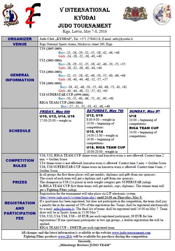 РЕГИСТРАЦИЯ И ВЗНОС Регистрация на турнир будет проходить через электронную систему LJF http://www.judo.org.lv/system/login.php~~HEAD=pobj до 24:00 в четверг, 5 мая . Если спортсмен был зарегистрирован, но не участвовал в конкурсе, команда должна заплатить штраф в размере 50% от суммы регистрационного взноса. Команды должны быть зарегистрированы в электронном виде по электронной почте: info@kyodai.lv Взнос 15 евро за каждого зарегистрированного участника, 30 евро если регистрация будет позже ! Если один спортсмен участвует в двух возрастных группах, применяется двойная оплата за регистрацию.