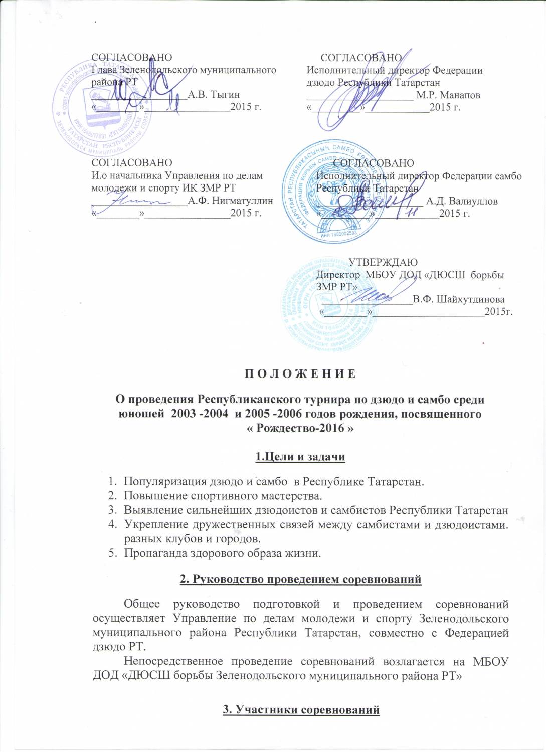 | 6-8 января в поселке Васильево Зеленодольского муниципального района Татарстана состоится республиканский турнир по дзюдо и самбо «Рождество-2016». На соревнования приглашаются юноши2003-2004 годов рождения и 2005-2006 годов рождения.