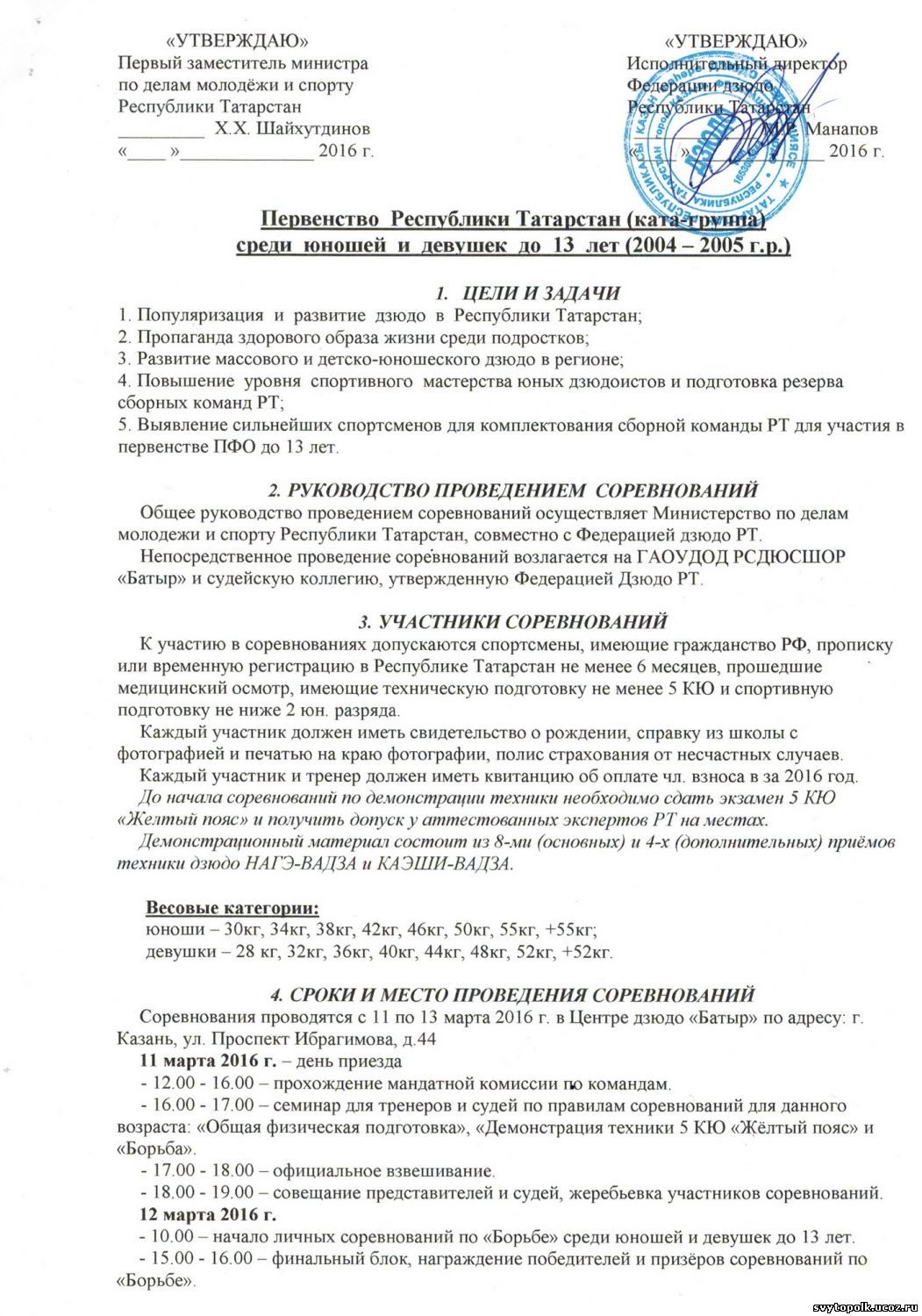 Федерация дзюдо Татарстана проводит Первенство РТ до 13 лет. ------------------------------------------------------------------------------- 11-13 марта в центре дзюдо «Батыр» г. Казани состоится Первенство Республики Татарстан до 13 лет (ката-группа). На официальные соревнования приглашаются юноши и девушки 2004-2005 годов рождения.