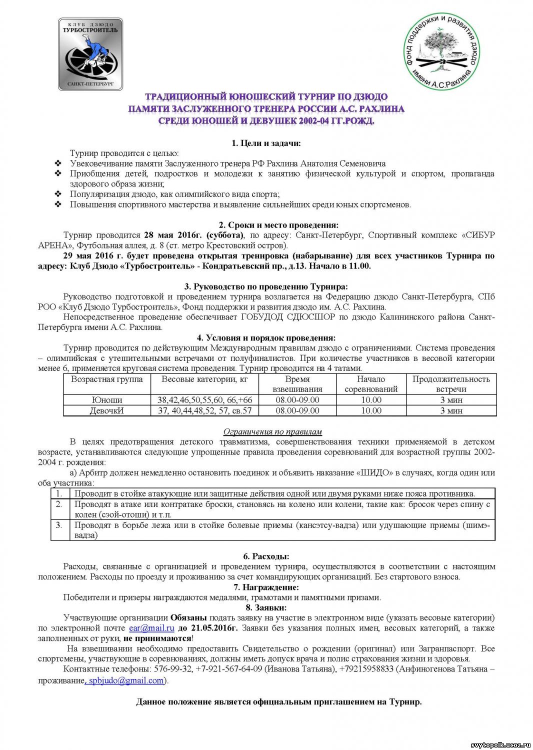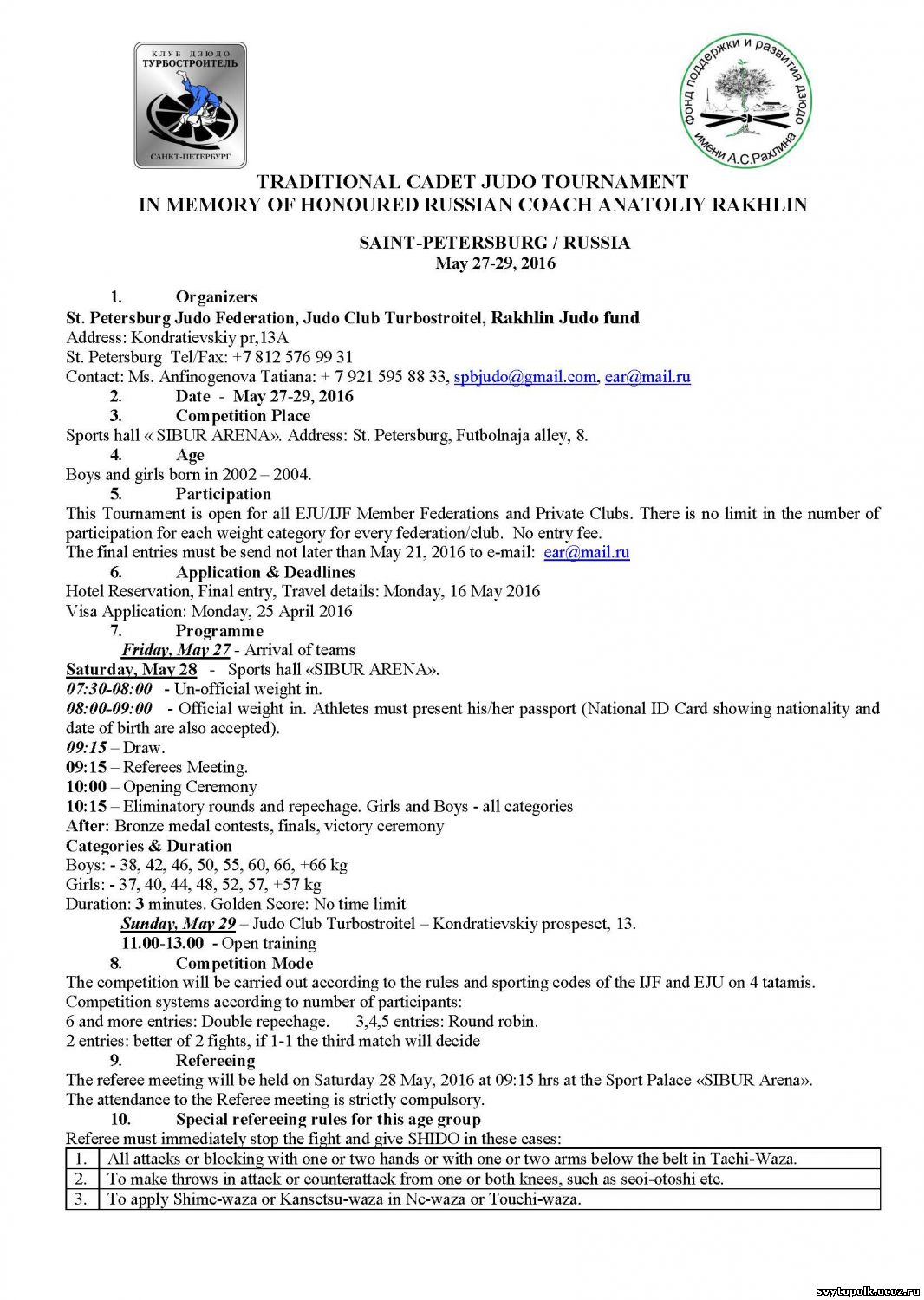 | 28 мая в спорткомплексе «СибурАрена» состоится традиционный юношеский турнир памяти Заслуженного тренера России Анатолия Семеновича Рахлина. На соревновательное татами приглашаются юноши и девушки 2002-2004 годов рождения. 29 мая в рамках турнира в зале клуба «Турбостроитель» будет проведена открытая тренировка для всех участников в формате набарывания. В этом году в турнире примут участие команды практически из всех регионов России и спортсмены из-за рубежа. Регламентом соревнований предусмотрены поединки в восьми весовых категориях у юношей и семи — у юниорок; самая легкая – до 37 кг, а самая тяжелая – свыше 66 кг. Соревнования будут проходить по действующим международным правилам дзюдо с ограничениями.