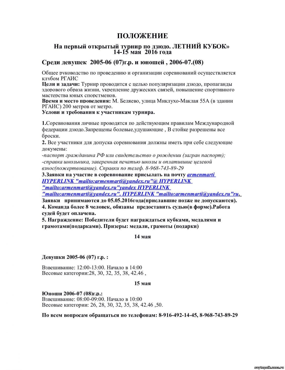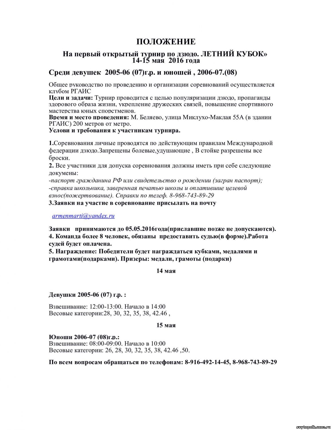 | В год проводятся 4 турнира. сентябрь- Кубок РГАИС, декабрь-Зимний Кубок, Март-Открытый Женский турнир и май - Летний Кубок. Из минуса зал 11x14.Если много участников то подключаю актовый зал и борьба на 4 татами 5х5 и 4х4 Судейство я считаю не плохое, смотрим все видео записи спорных моментов,бес предела не допускаю,хотя и судят подростки. Хорошие призы и медали ,дружеская атмосфера , Приезжая к нам вы всегда будьте уверенны что реально победит сильнейший. 14 мая у девочек спонсоры обещают за 1 место дополнительный приз кимоно.а у юношей футболку, точнее будет известно 12 мая.