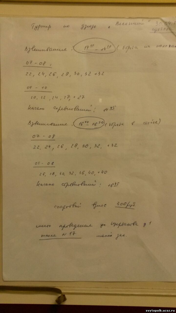 | 07-08 -22,24,26,28,30,32,32+взвешивание в 16-16.30 начало в16,45 взнос 300руб по времени схватки инфы нет,судя по прошлым турнирам -2мин