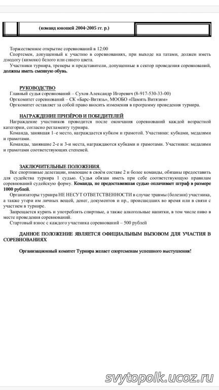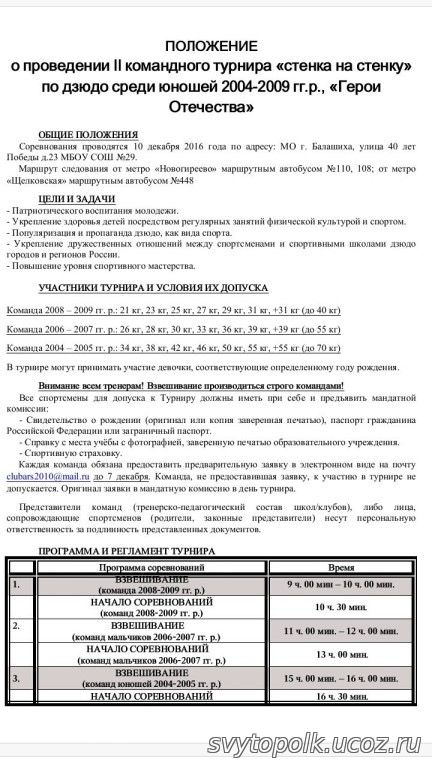 | Уважаемые гости нашего турнира , все, кто собирается приехать и участвовать! Предварительные заявки на участие должны быть ОБЯЗАТЕЛЬНО отправлены на электронную почту ДО 7 декабря! Спасибо за понимание!
