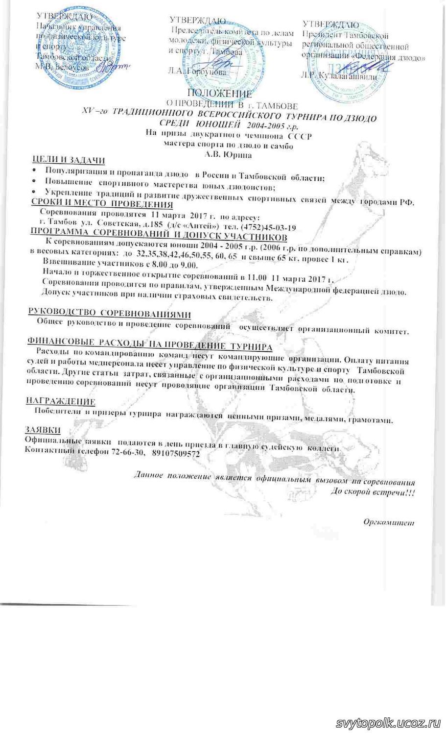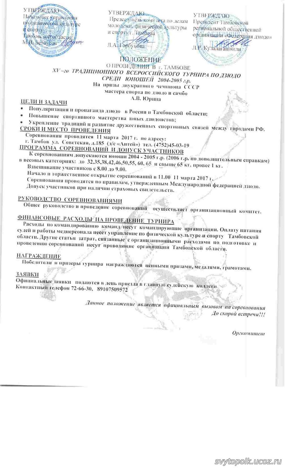 | Хороший юношеский турнир!В этом году будет проходить в большом многофункциональном спортивном зале Дворца спорта "Антей". Положение здесь,в перечне положений: https://vk.com/topic-127041467_36154808 (не смог в другой формат перевести,кто сможет-выложите).