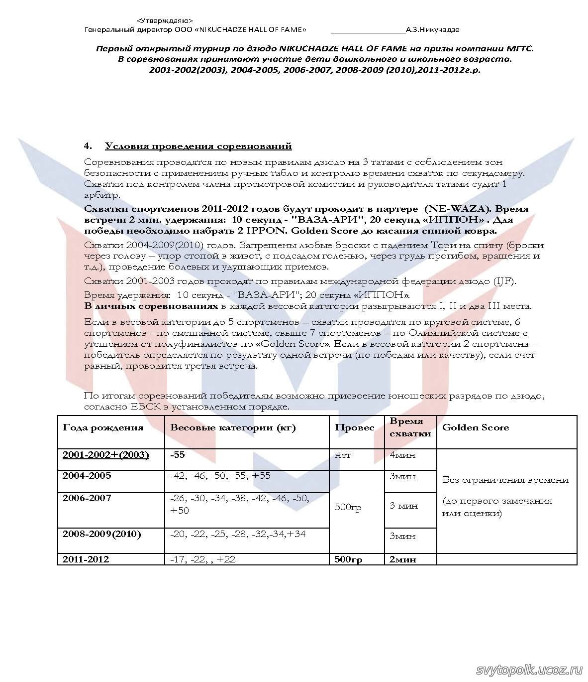 | Цитата Georgi-87 (  ) Эти соревнования проводятся для детей которые начали заниматься,и чтоб не потеряли интерес к дзюдо(мотивации) ДЕТСКИЙ ПРАЗДНИК!!!!!! Уважаемый Georgi-87, какие-же дети,ТОЛЬКО НАЧАВШИЕ ЗАНИМАТЬСЯ,2001-05 годов рождения!!!Это уже СТАРШИЕ,СРЕДНИЕ и МЛАДШИЕ юноши и девушки,прозанимавшиеся от 4 (минимум) до 9 лет!!! И провести турнир по 24 весовым категориям и пяти возрастам на 3-х татами нормально можно только в случае малочисленности участников в весовых категориях.