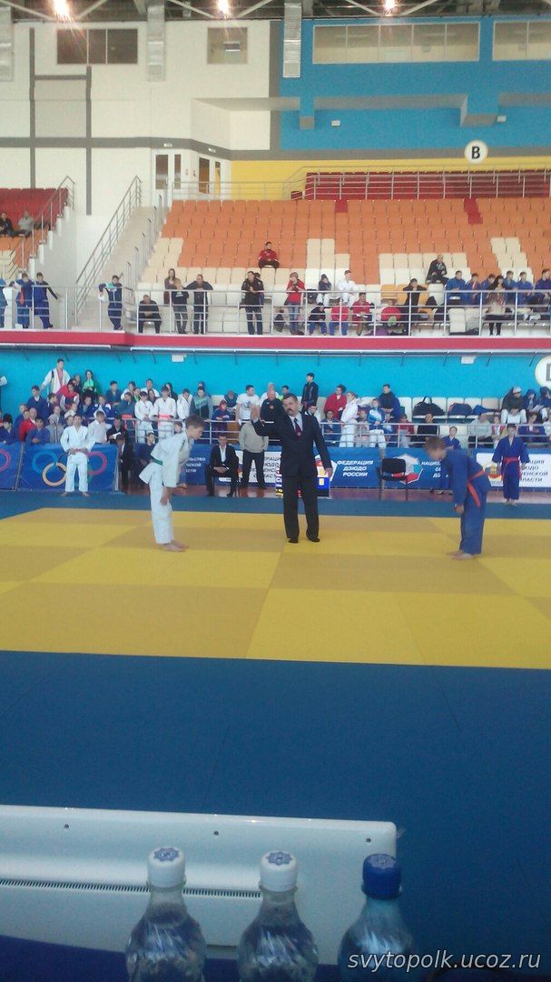| Первую выиграл иппоном у Башкирии,вторую два вазаари у Оренбурга,третью проиграл два вазаари Удмуртии,первую утишиловку выиграл болевым у Самары,вторую проиграл удержанием.Итог-7 место.Учитывая,что по младшему году и первый раз на округе-нормально,так приблизительно и планировалось.Готовимся к командной борьбе.