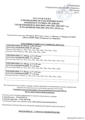 | мама_самбиста_ | Дата: Пятница, 03.03.2017, 09:50 | Сообщение # 6 |  |  Мастер форума Группа: Друзья Сообщений: 1300 Статус: Offline | Цитата zubkov (  )  Почему бы сразу не написать в положении, что 2005 борется отдельно от остальных возрастов. И где гарантии, что, это будет именно так.zubkov .. конечно гарантии будут ... это ж Марьино ..